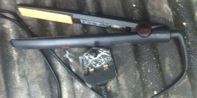 Hair straighteners with a broken plug, not only were they taped together due to a missing screw, the earth pin was also taped in.